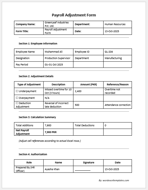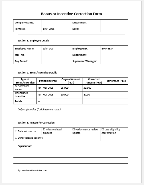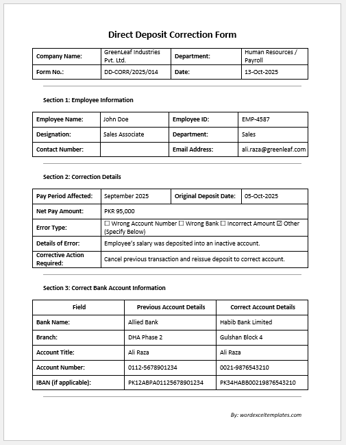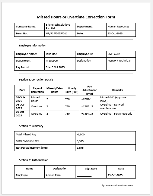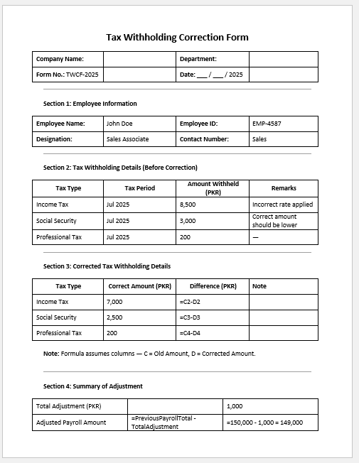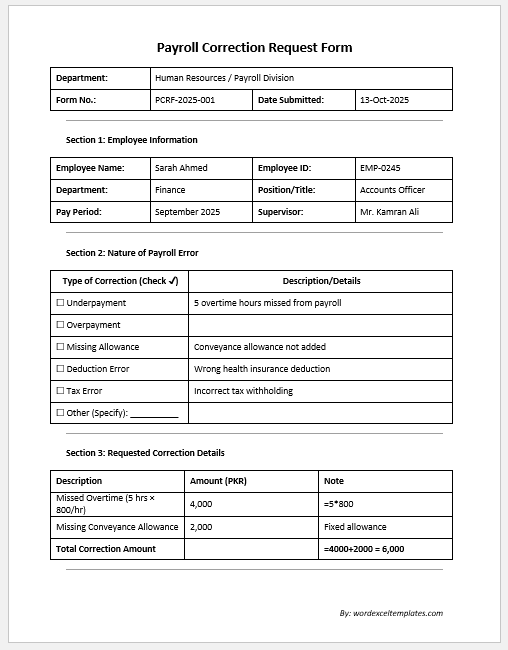 Payroll Correction Request Form: A document used by employees or HR staff to report and request the correction of payroll.