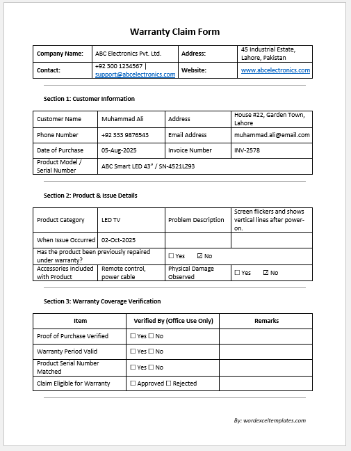 - Warranty Claim Form -used to process claims for repair or replacement.