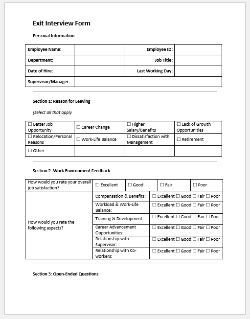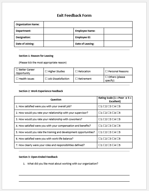 - Exit Interview Form -gathers feedback about the employee’s experience and reasons for leaving.