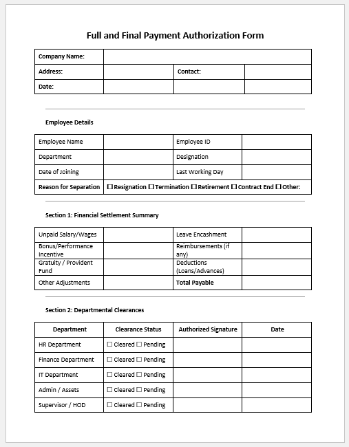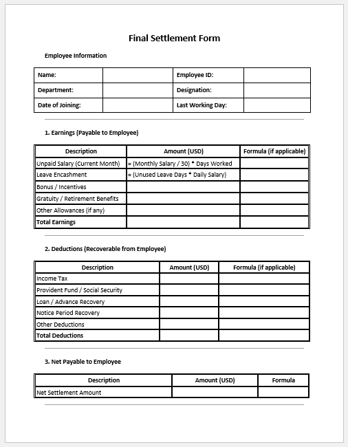- Final Settlement Form -calculates and finalizes outstanding payments or dues.