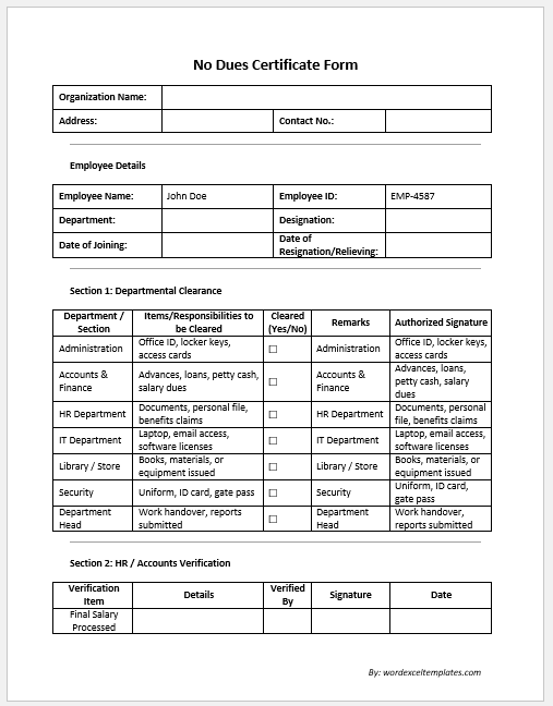 - No Due Certificate -verifies that the employee has no pending financial or material obligations.